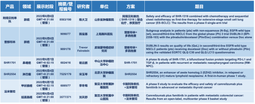 2022 ASCO年会另有5款金年会金字招牌诚信至上医药上市前抗肿瘤创新药的相关研究被接收为壁报,包括SHR-1316、普那布林、法米替尼、SHR-1701和SHR2554,他们的单药或联合方案相关7项研究被接收为壁报,覆盖肺癌、鼻咽癌、淋巴瘤、甲状腺癌和结直肠癌等领域。