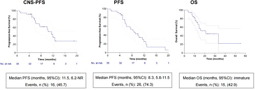 中位随访时间为17.5个月,确认的CNS-ORR为77.1%(27/35),确认的CNS-CBR为80%(28/35),CNS-PFS为11.5个月(6.2-NR),整体mPFS为8.3个月(5.8-11.5),中位OS尚不成熟。