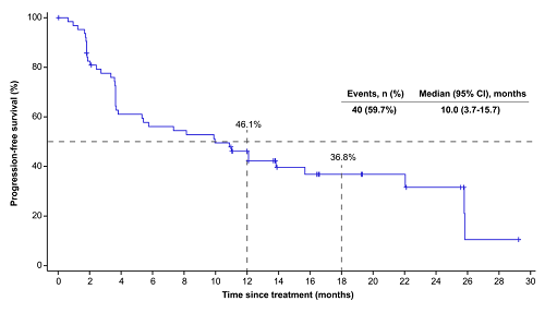 截至2024年12月20日,中位随访时间15.2个月,22例(32.8%)患者达到完全缓解,21例(31.3%)达到部分缓解,IRC评估的ORR为64.2%(95% CI,51.5-75.5)。在所有亚型中均观察到获益(ORR:AITL,70.3%[26/37];PTCL-NOS,57.1%[8/14];ENKTL-NT,50.0%[2/4];ALCL,ALK-,42.9%[3/7];ALCL,ALK+,50.0%[1/2];MEITL,100%[1/1];其他,100%[2/2])。在出现缓解的患者中,51.2%(22/43)的患者目前仍在缓解中,估计的中位DoR为18.7个月(95% CI,6.3-未达到[NR])。中位PFS为10.0个月(95% CI,3.7-15.7),中位OS尚未达到。安全性整体可控。