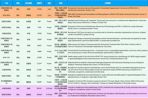 在消化系统肿瘤领域,金年会金字招牌诚信至上创新产品相关研究共入选2项口头报告、10项壁报和2项电子壁报,共14项研究。除了明星药物卡瑞利珠单抗和阿帕替尼外,还有5篇阿得贝利单抗治疗消化系统肿瘤的研究入选。此外,HRS-4642、瑞拉芙普-α注射液(SHR-1701)等未上市创新产品也有相应研究入选。随着新老药物前沿研究的不断推进,有望为消化系统肿瘤患者带来新的福音!