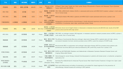 在胸腺上皮肿瘤、头颈鳞癌、肉瘤、前列腺癌、甲状腺癌等其他多个疾病领域,卡瑞利珠单抗、阿帕替尼、瑞维鲁胺、阿得贝利单抗、法米替尼、HRS-7058、HRS-4642、HRS-5041等抗肿瘤创新药相关研究一共入选了4项口头报告、1项简短口头报告、5项壁报,彰显了金年会金字招牌诚信至上医药强大的研发实力。此外,海曲泊帕和昂丹司琼口溶膜分别在防治化疗导致的血小板减少和恶心呕吐方面各有1项研究入选壁报。