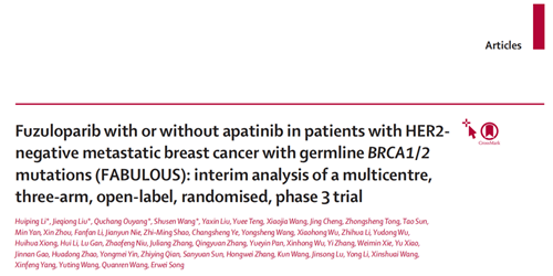 1.  Huiping Li, et al. Fuzuloparib with or without apatinib in HER2- metastatic breast cancer (mBC) patients (pts) with germline BRCA1/2 mutations (gBRCA1/2m): A randomized phase III trial. Volume 26,lssue 12,P1563-1574,December 2025.