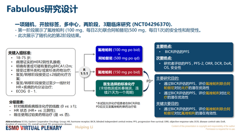 主要研究终点为由盲态独立影像评审委员会(BIRC)评估的无进展生存期(PFS);次要疗效终点包括研究者评估的PFS、客观缓解率(ORR)、疾病控制率(DCR)以及总生存期(OS)等。研究采用固定序贯检验,优先检验氟唑帕利联合阿帕替尼 vs. 医生选择标准化疗的优效性(单侧α=0.0067),若达到优效性则进一步检验氟唑帕利单药 vs. 医生选择标准化疗的优效性(单侧α=0.0069),若达到优效性则最后检验氟唑帕利联合阿帕替尼 vs. 氟唑帕利单药的优效性(单侧α=0.0105)。
